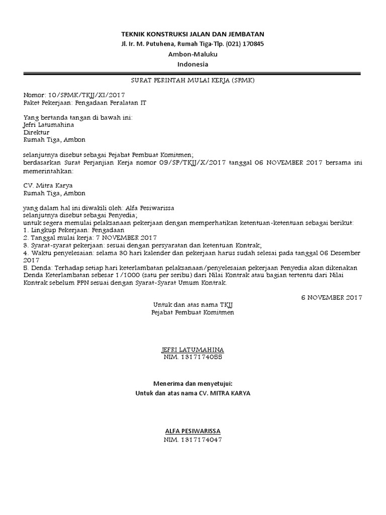 Contoh Surat Perintah Kerja SPK Yang Baik dan